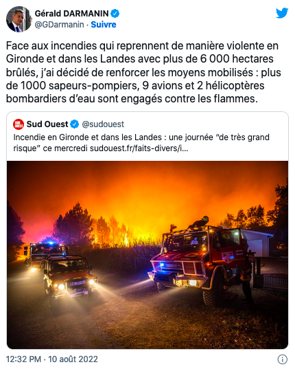 最新情况是法国内政部长热拉尔德·达尔马宁(Gérald Darmanin)8月10日12:32亲自发布信息来通报: