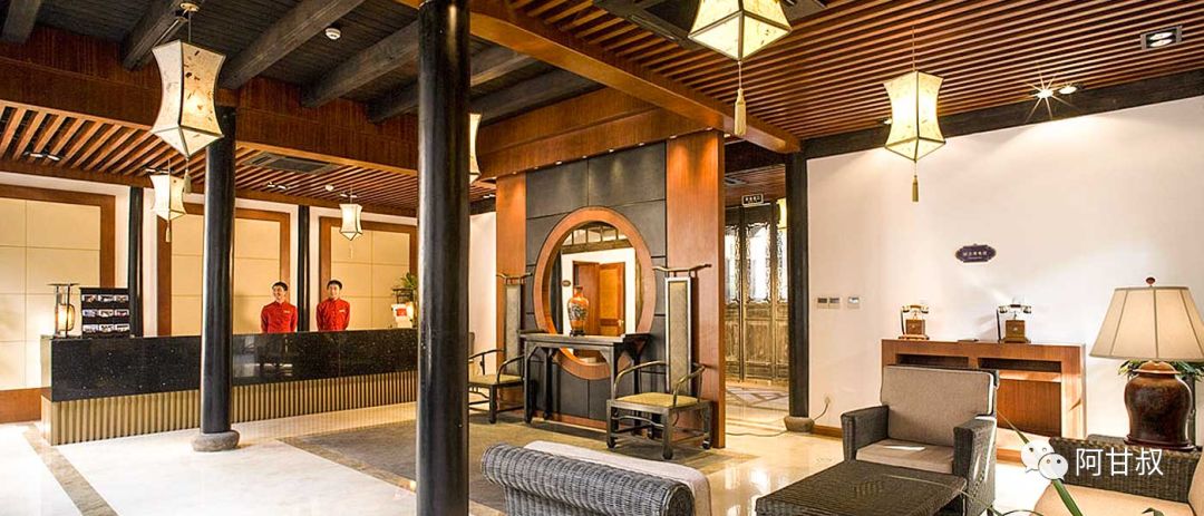 如果不是景区叫了些演员在这个围墙的门口摆拍了这样一个画面,你很难注意到穿过围墙的那个小门洞,后面藏了个五星级标准,拥有345间客房,从豪华总统独幢套房到家庭临河套间、标准间一应俱全的高级度假酒店。