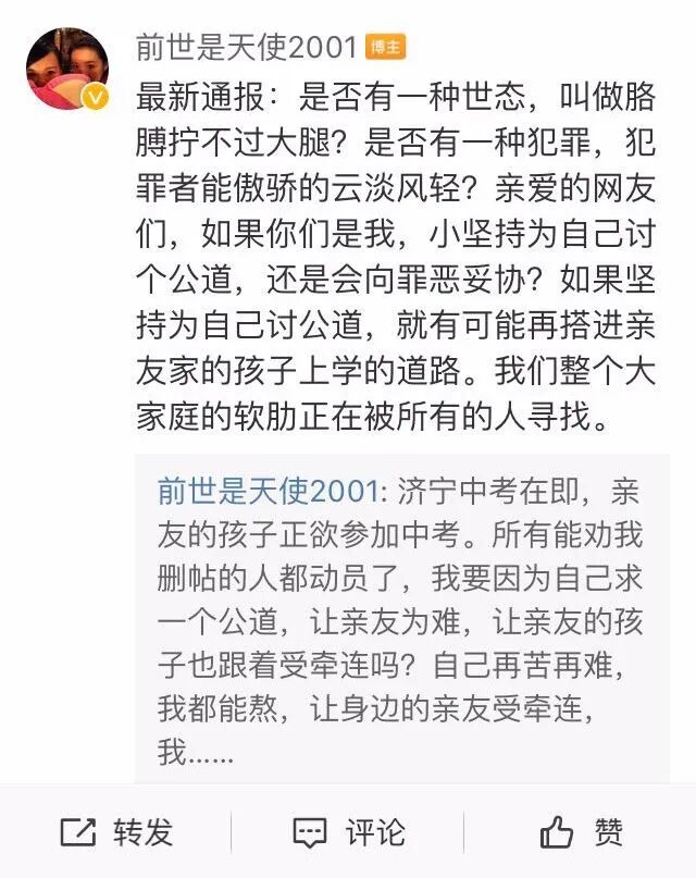 苟晶在自己微博中这样写道:济宁中考在即,亲友的孩子正欲参加中考。所有能劝我删帖的人都动员了,我要因为自己求一个公道,让亲友为难,让亲友的孩子也跟着受牵连吗?自己再苦再难,我都能熬,让身边的亲友受牵连,我……