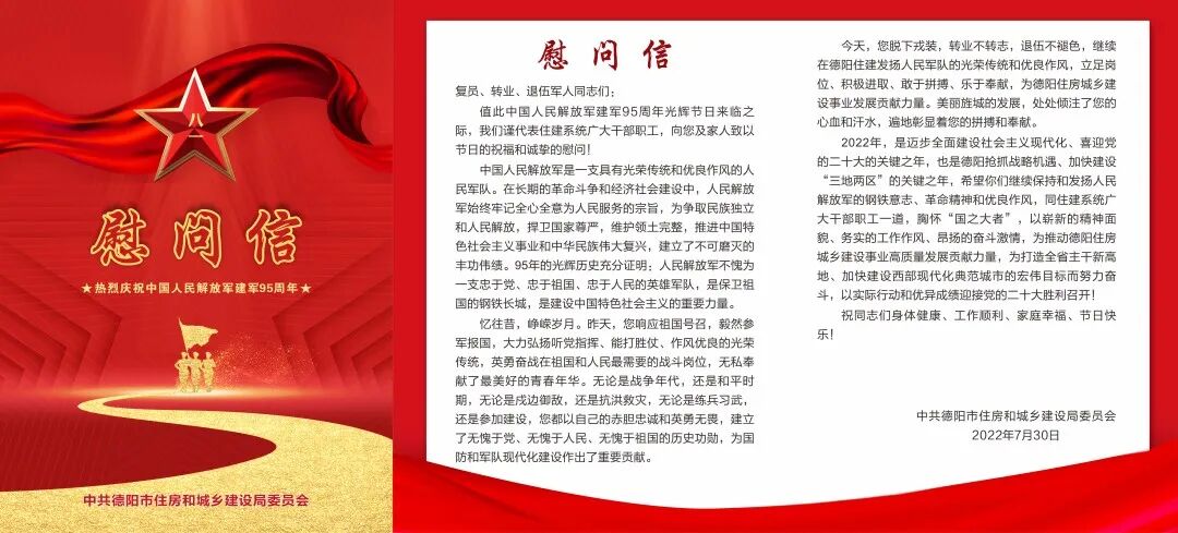 建军节到来之际,局属单位走访慰问双拥对象、召开“八一”建军节座谈会等方式,与退役军人同志们共忆军旅生涯,共叙战友之情,共庆建军95周年。同时,激励同志们退役不退志、退伍不褪色,初心不变、笃行不怠,发扬人民军队的光荣传统和优良作风,为德阳住房城乡建设事业发展贡献力量,传承弘扬老兵精神为军旗增光添彩。