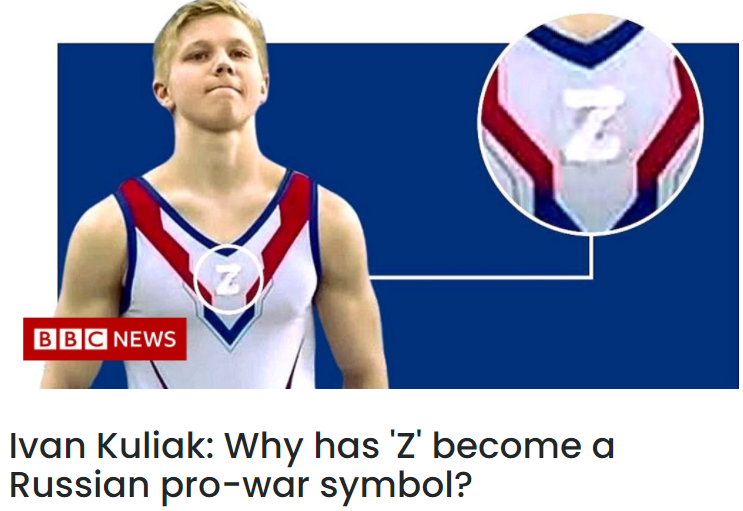此前,俄罗斯体操运动员伊万·库利亚克(Ivan Kuliak)因在领奖台上穿了一件胸前印有字母“Z”的背心便被国际体操联合会调查,法国奢侈品品牌LV还因饰品上的标志设计形似字母“Z”引发争议……