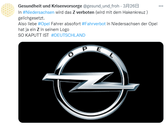 还有人说:“下萨克森州把字母Z等同于纳粹的万字符”。那么欧宝汽车应该禁止上路,因为它的Logo中有字母Z。德国真是彻底坏掉了。”