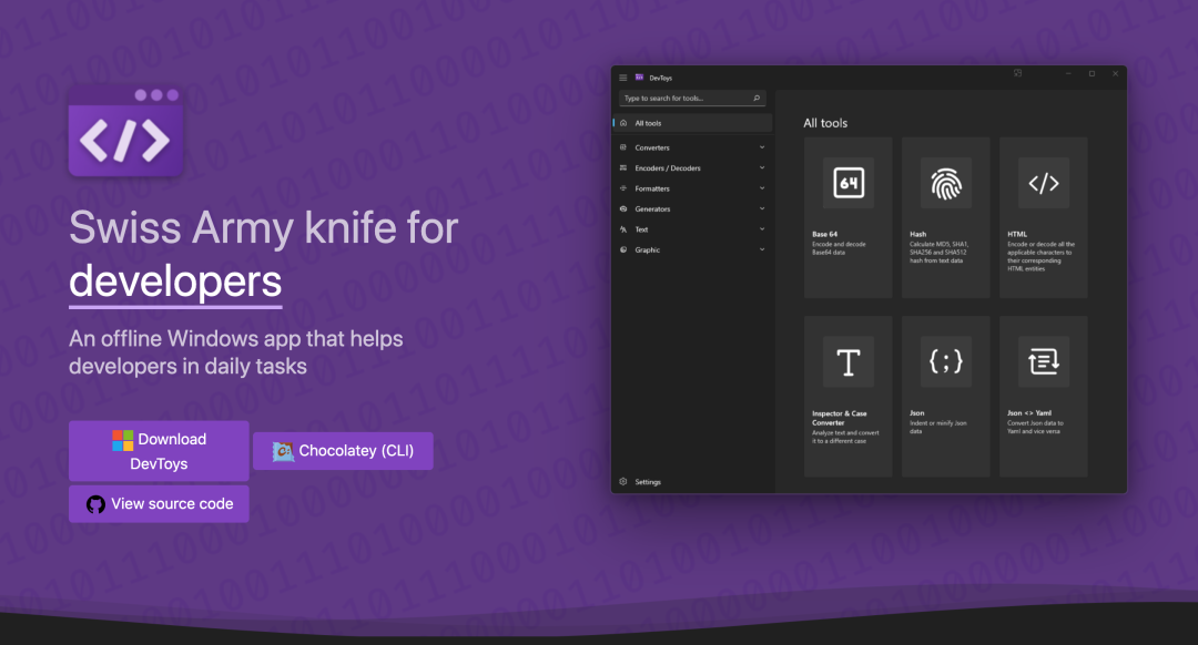DevToys 是专为 Windows 制作的工具,还支持画中画模式、可以将工具固定到开始菜单、工具搜索、语法高亮、多个实例、深色/浅色主题等功能。