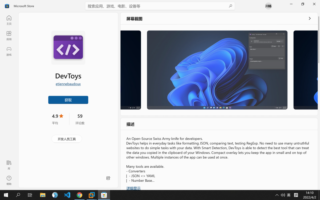在 Microsoft Store App 中搜索 DevToys 或单击lianj https://www.microsoft.com/store/apps/9PGCV4V3BK4W 即可安装。