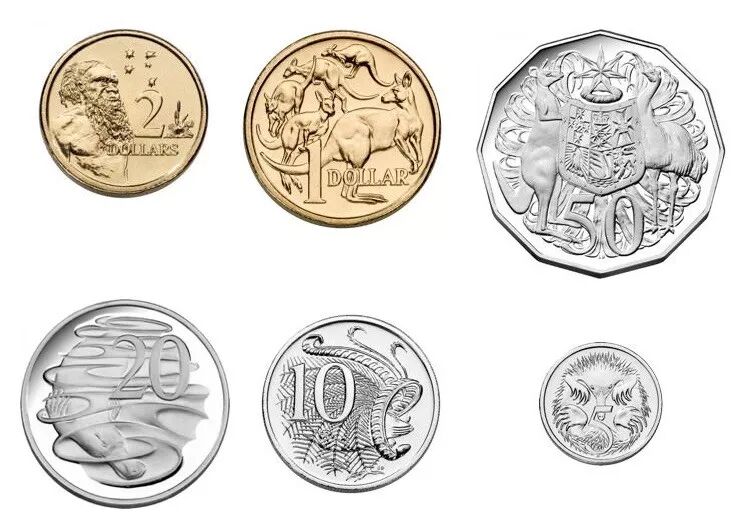 5分,10分,20分和50分的银色硬币和1澳币和2澳币的金色硬币。