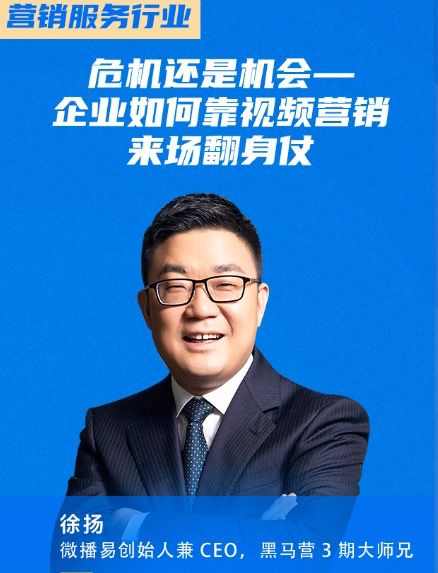 而针对当下的视频营销、线上营销问题,创业者存在不知道怎么入局,怎么去玩,哪些平台适合自己品牌等多方面系统性问题。为此,2月14日,微播易创始人兼CEO徐扬,受邀参与黑马“穿越疫情”系列公益直播,带来《危机还是机会?企业如何靠视频营销来场翻身仗!》的线上直播分享,帮助被疫情打入谷底的创者们,走出视频营销迷茫。