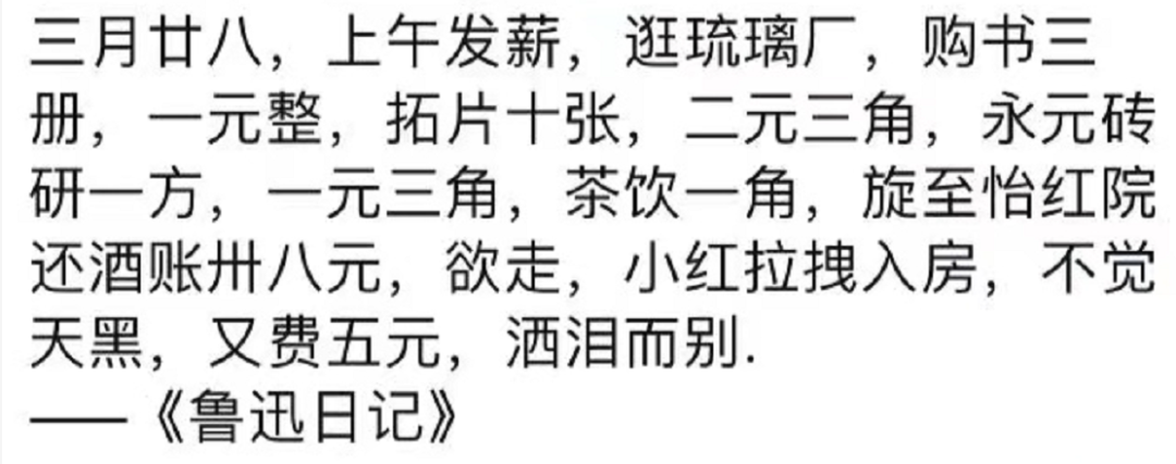 至于“小红拉拽入房”,可谓群众喜闻乐见的重点,你看,连民族魂鲁迅都嫖妓,我等算啥。但其实完全是虚构。我感觉鲁迅不大会用“拉拽入房”这样的词汇,鲁迅日记的文风,总体比较典雅,属于浅近文言,如果他确实碰到了小红拉拽,估计也只会说“小红援入室”或“见揄引登榻”之类。后面“不觉天黑,又费五元、洒泪而别”这样的句子,估计更是高小毕业的乡下文人手笔。五元在当时不是小数目,当年一个警察的月薪比这高不了多少。而小红这个名字听起来也不像大妓院的花魁娘子,若是花魁娘子,也初不需“拉拽”客人。大概就算包夜,也要不了五元,鲁迅何至于天黑就走,回家面对冷清的四壁呢?且既是被拉拽进去的,并非情投意合,又何至于洒泪而别。