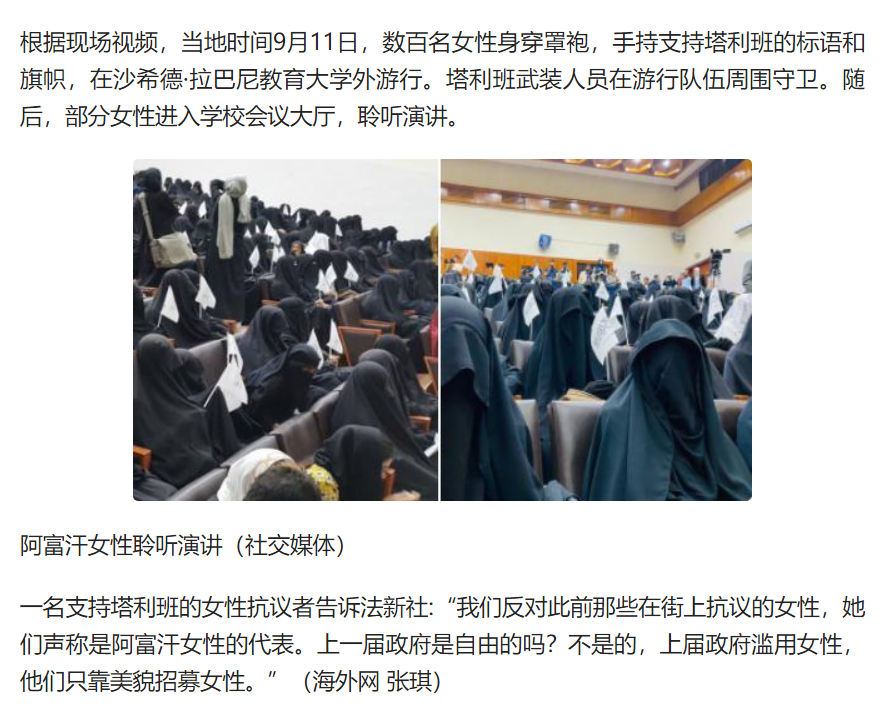 “我们反对此前那些在街上抗议的女性,她们声称是阿富汗女性的代表。上一届政府是自由的吗?不是的,上届政府滥用女性,他们只靠【美貌】招募女性。”