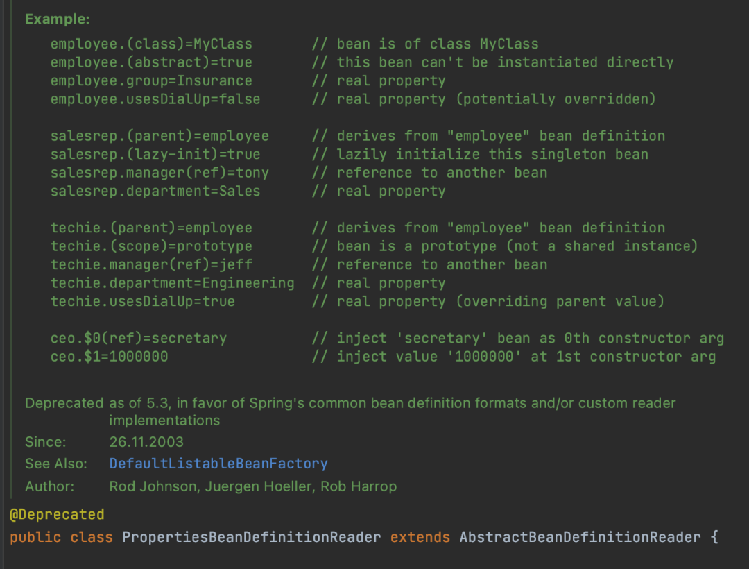 除了可以配置属性之外还支持其它的配置,如何配置可以查看PropertiesBeanDefinitionReader类上的注释。