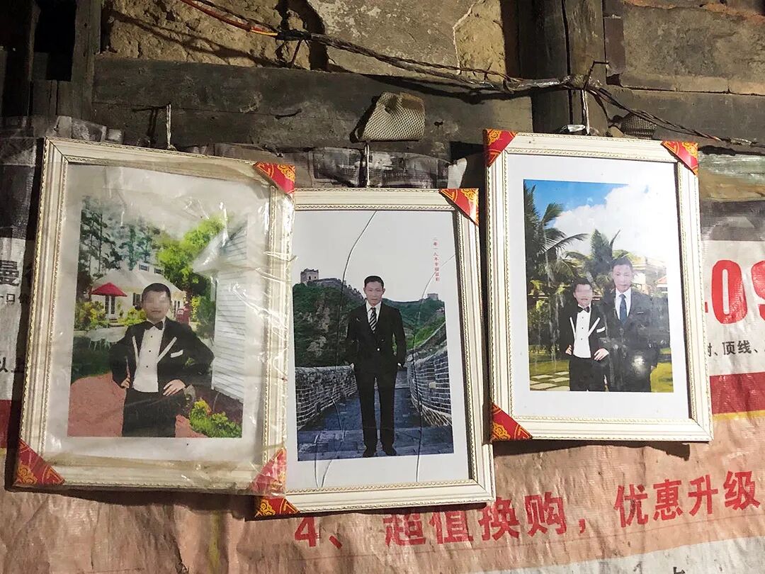 我在一座菜市场附近见到了男孩的父亲周庭福。他50岁,1992年前从重庆老家来到泉州,一直在干环卫工,负责附近小区周边400米左右的路段清理工作。想要进入他的家门要穿过一条狭窄幽暗的通道,一只枯瘦的小猫在一旁喊叫。家中的地面似乎未经处理过,黑乎乎的。墙上挂着父子的三张照片,是在菜市场里“用电脑拍的”,背景是长城还有别的旅游景点,加上装裱费一共30。