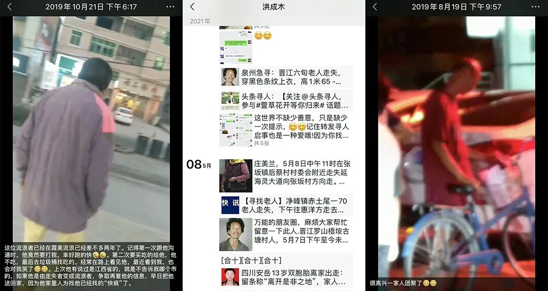 霞美镇位于福建泉州,不大,骑电动车二十多分钟就能从这头跑到那头。当地人称之为“大霞美”,只是相对另一个也叫霞美的村子。在这里,人和人的社会关系紧密,每个人都是“朋友”、“亲戚”,或者“朋友的朋友”,“亲戚的亲戚”。几年前洪成木还在家附近的电子厂干活,看见有人走失的消息就转发到朋友圈。很多人会觉得发朋友圈没啥用,他不理解,为什么会有人这么觉得。