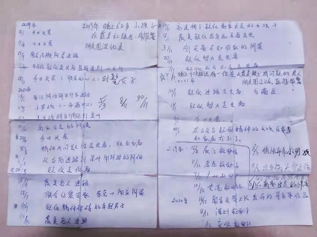 外卖骑手洪成木的黑色钱包里永远塞着一张破纸片,A4纸,布满折痕,折起来的每一个边角都泛黄。摊开它只能用两根手指,稍有不慎就能烂成几截。洪成木牢记着纸片上标注的、每一天发生的事,日期从2019年1月8日开始,有些能精确到几点几分——内容主要是寻人。过去的两年里,他游走在霞美镇,比送外卖更重要的是,寻找那些走失在街头的人。现在,纸片上的数字增加至35(包括通过线上比对找到的7名走失者),并且在不断增加。