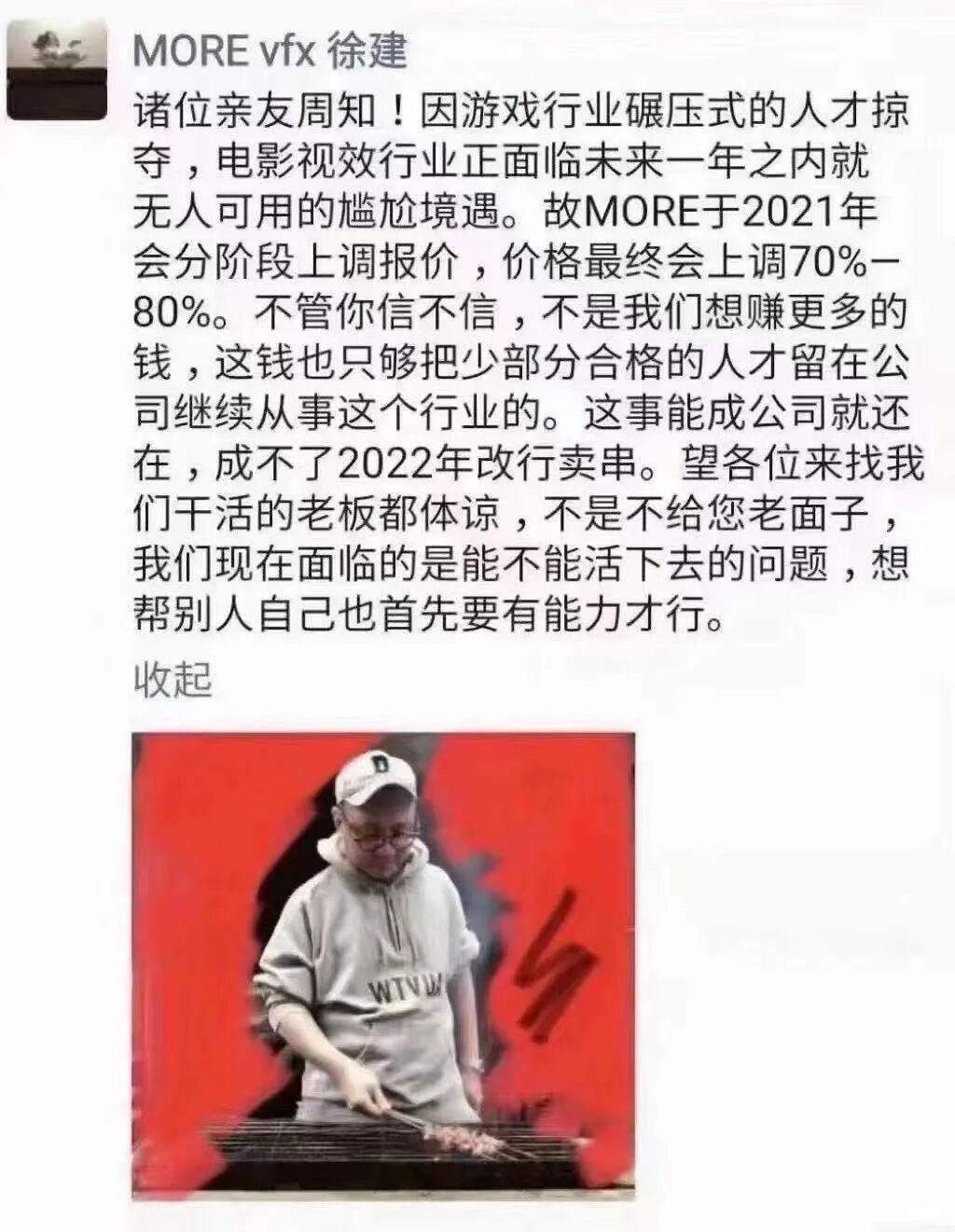 更疯狂的是,上海游戏圈的薪资涨幅还对影视圈形成了压迫。视效制作公司MORE VFX创始人徐建曾发布朋友圈,吐槽游戏行业正在进行「碾压式的人才掠夺」,说为了留住员工,准备把报价上调70%-80%。《唐人街探案》系列导演陈思诚也在路演时提到过这个例子。