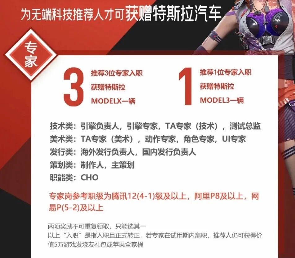 而在金三银四之际,多家公司都推出了推荐人才获得奖励的制度,报酬一般在1万-5万不等。同在沪杭圈的无端科技,甚至打出了「推荐专家入职,赠送特斯拉MODEL」的广告。
