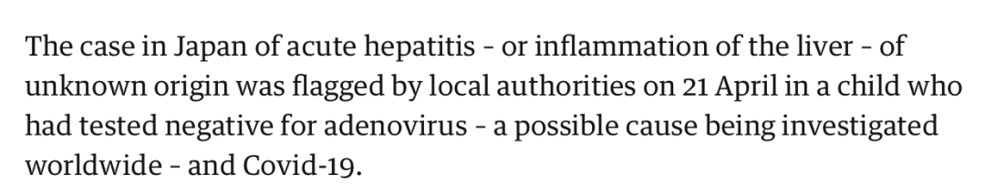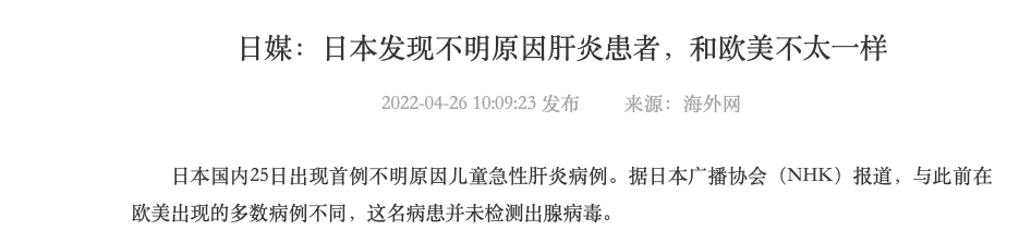 4月21日,日本地方当局发现了一名不明原因的急性肝炎病例,确诊病例为一名不满16岁的儿童。