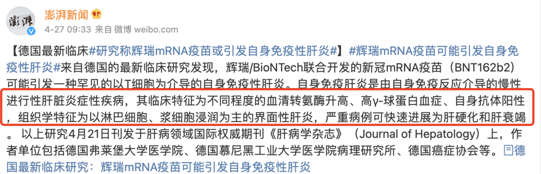 一边是“不明原因肝炎”病例数飙升,一边是研究显示:辉瑞mRNA疫苗或引发自身免疫性肝炎,两个消息和在一起很容易引发热议和猜想。