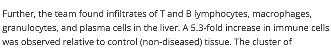 此外,研究人员还在患者的肝脏组织中发现了T细胞和B淋巴细胞、巨噬细胞、粒细胞和浆细胞的浸润。