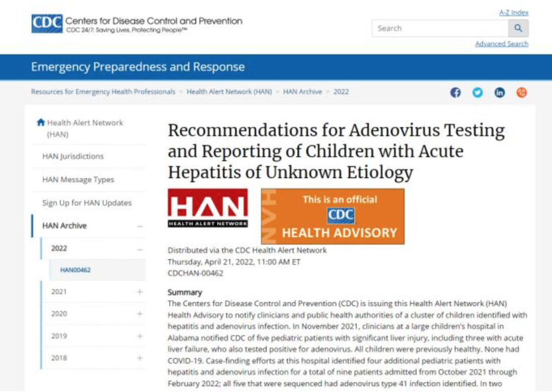 要求家长和医护人员密切关注有关症状,向当地和州卫生部门报告任何源头不明的潜在儿童肝炎病例。
