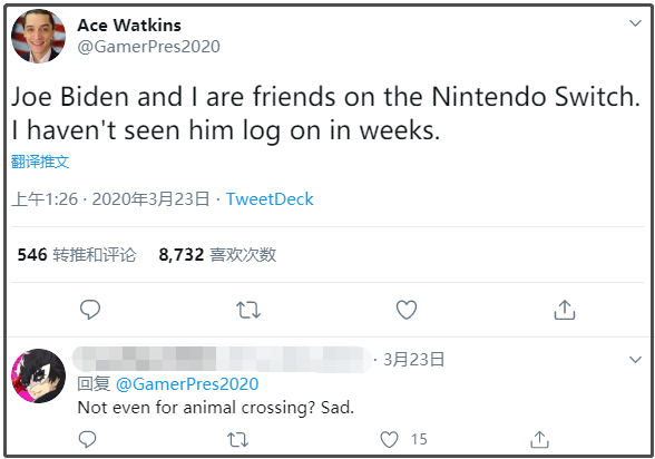 当然,秉持“政客”之道的Watkins同样擅长揶揄其他竞争对手。他声称自己和民主党候选人拜登是NS上的好友,但他发现拜登已经一个多星期没有上线,而那刚好是NS《动物森友会》正式发售后的第三天。