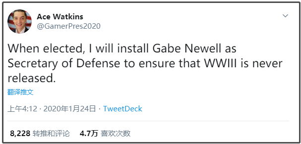 这一系列的有趣讽刺,让Watkins以“玩家总统”的名号迅速在互联网上为人所知,不论Reddit论坛还是推特,他的言论总能引起一部分人的共鸣,以至于他几天没发声,部分追随者便会陷入焦虑的等待。