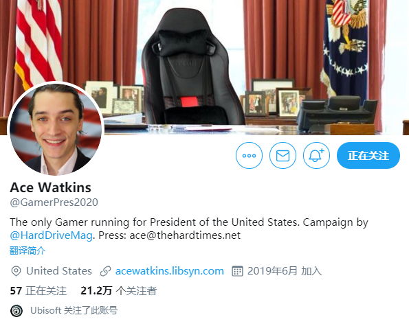 “我是Ace Watikins,正致力于成为美国第一任玩家总统。我会在这里每周介绍我的团队以及我的朋友和家庭,讨论与你相关的重要议题:美国的玩家们。所有内容,尽在「Ace Watkins总统时间」。”