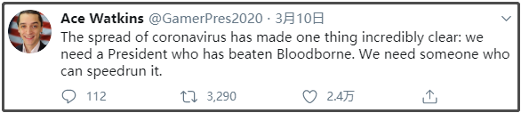 他表示“我们需要一位已经打通《血源》的总统,也需要那些可以速通的大佬。”(血源的主舞台“亚楠”同样是个瘟疫肆虐的地方)