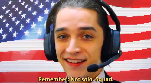 最后还创造了一句游戏意味十足的双关口号,“Remember,Not solo,Squad”(记住,别单挑,组队上)