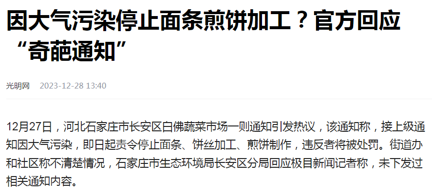 河北石家庄,一家菜市场发通知,“因大气污染停止面条煎饼加工”。舆论关注后,该通知被废止。