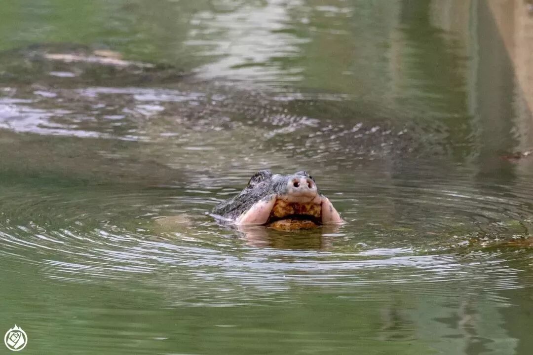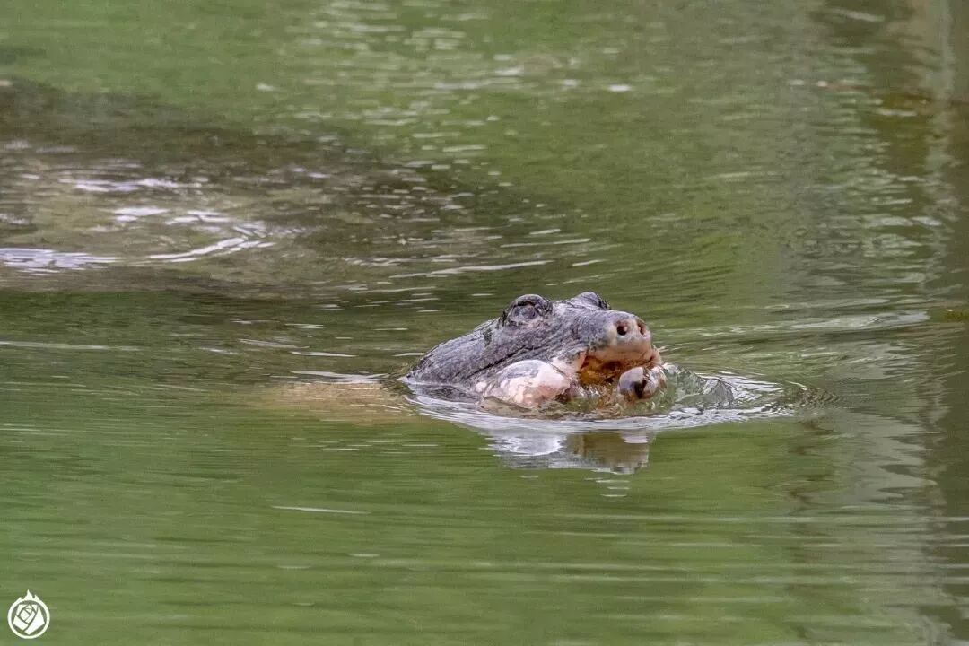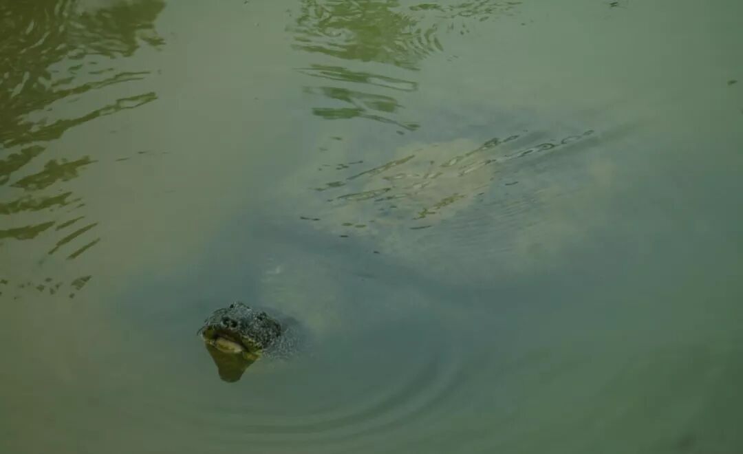 你会见到一头近2米长像黑色巨石一般的大鳖,在池塘里慢慢的游泳。它在大多时候潜在水下,这时你很难发现它。但每隔几分钟,斑鳖就会露出水面换个气。只见它把猪一样的鼻子戳出水面,随后是方形的大口,在水中吐着泡泡。它会在水面吸上一大口气,然后再次沉入水中。