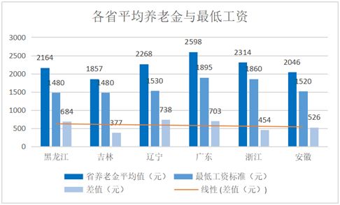 以2016年国家统计局数据为准,拿东三省各省平均养老金与最低工资作比较,结果为黑龙江省平均养老金高出最低工资684元,吉林省平均养老金高出最低工资377元,辽宁省平均养老金高出最低工资738元。