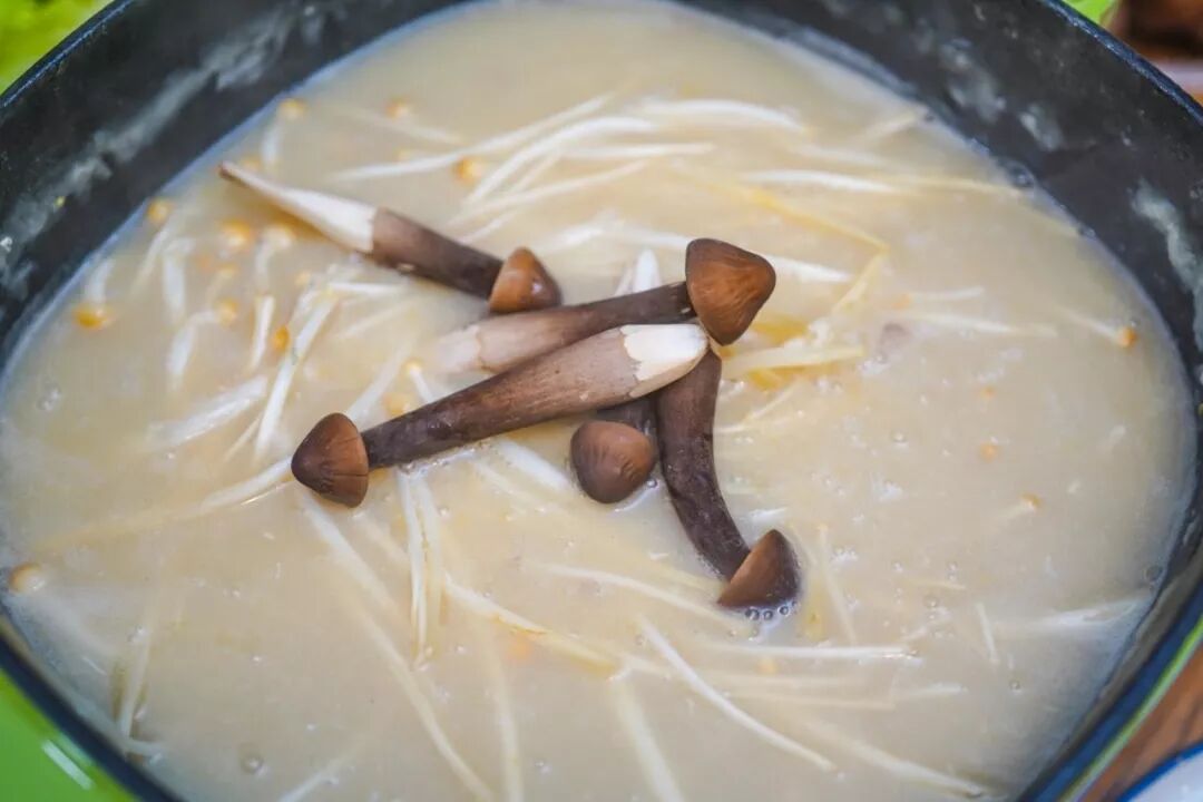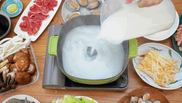 到了蔬菜环节,就选一些自己爱吃的菇类和蔬菜。此时的汤底,随便丢一点生菜进去都好吃极了。广东人民善于熬粥,他们也认为粥的精华就在于明火熬出那一层「粥油」。「粥油」又叫「米油」,是指粥熬好后,上面浮着的细腻黏稠,像膏油一样的物质。