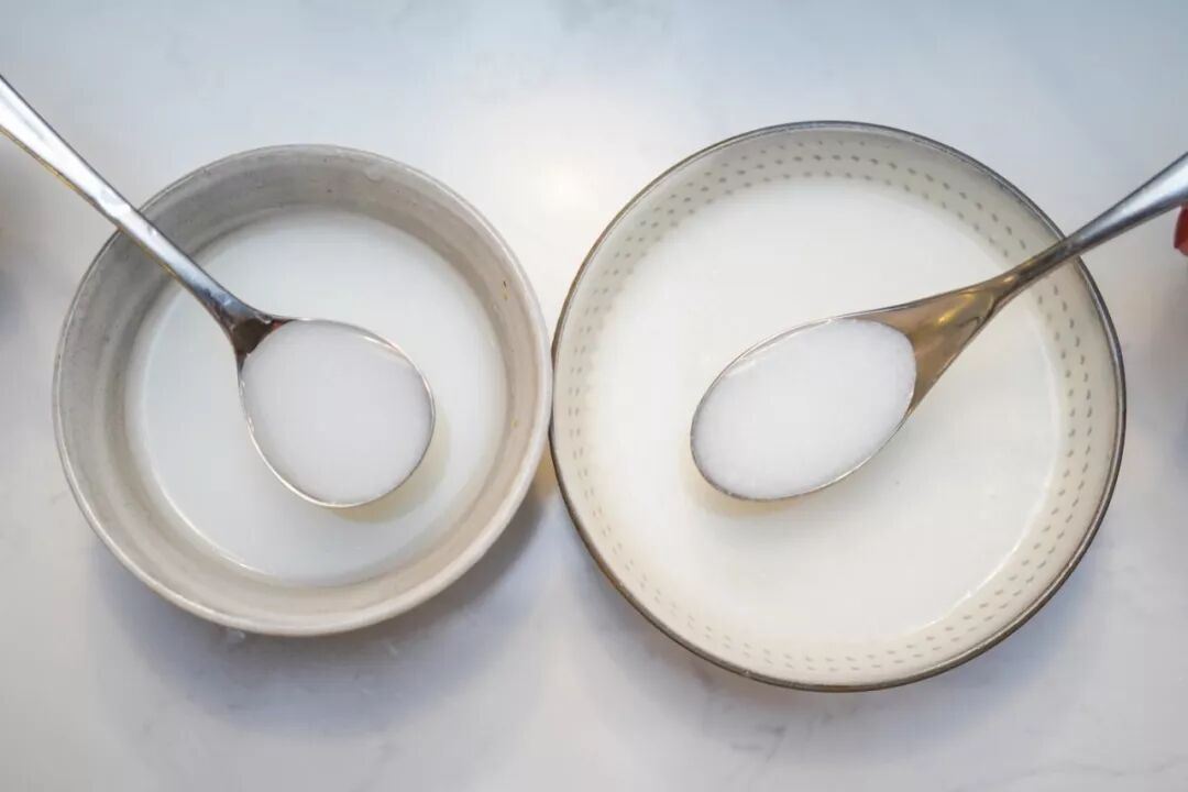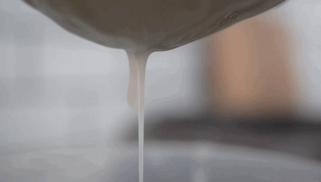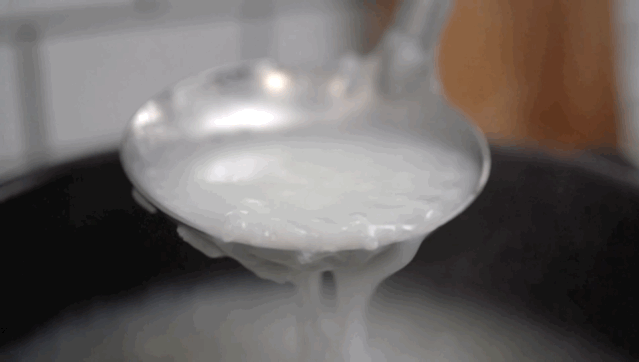研究员也做了很多研究,比如如何抛弃砂锅,用电饭煲煮出粥油。熬出粥油的秘诀是持续的猛火但是又不扑锅。家庭电饭煲精煮键火力较大,但是太智能的电饭煲,在粥沸后都会减小火力,所以并不合适熬出粥油。有个快速的方法,就是加水煮开后,用搅拌机把粥米打碎,然后放入锅中再煮开。左边是粥油,右边是打碎后的米浆。左边的颜色更黄,更薄,质地更滑,米香味更浓郁。