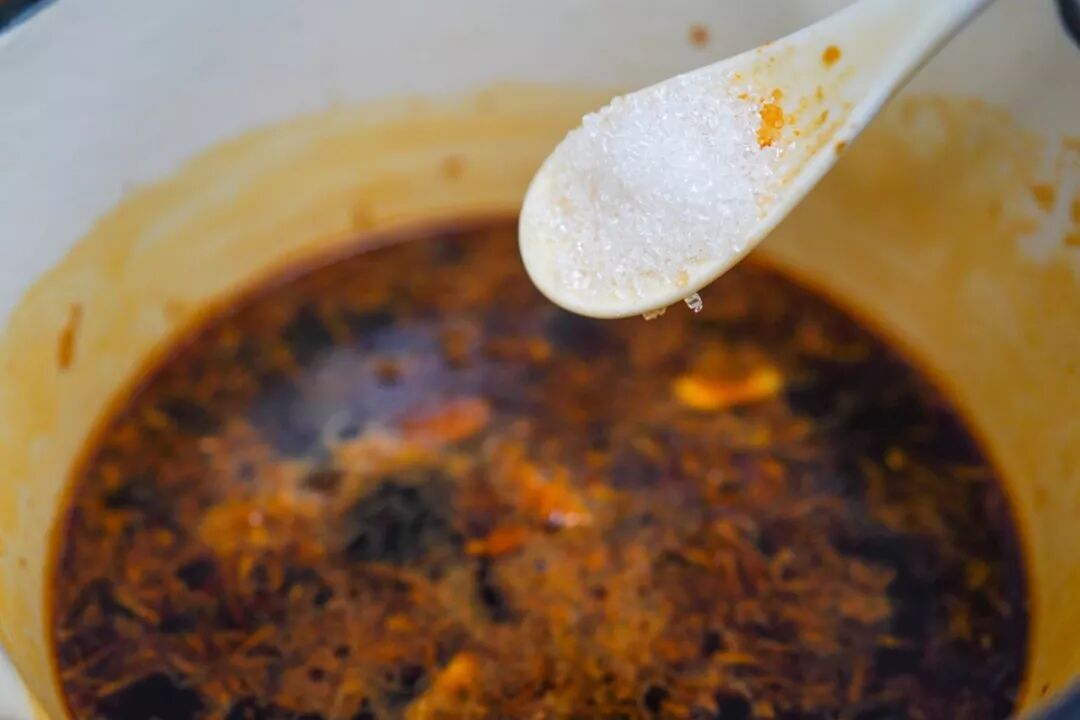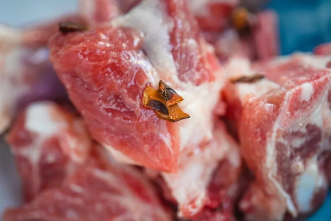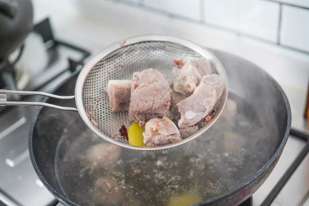 买半斤排骨、用10克左右的盐,2瓷勺料酒,2颗八角(掰碎)去腌渍,放上保鲜膜冷藏过夜。涮火锅前,猪骨提前加入粥底,煮一会儿粥底会更有味。
