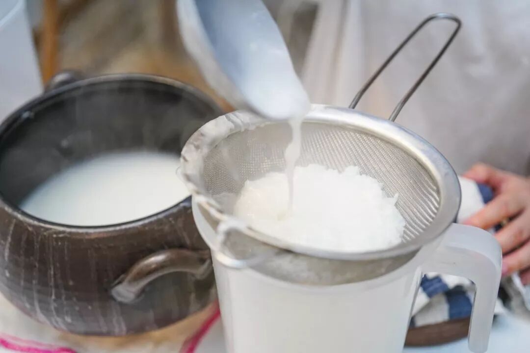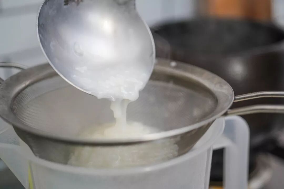 每个家庭火力都不太一样,以锅内粥米保持冒泡的状态为标准。如果用砂锅,大约45分钟后,粥就慢慢变稠,出现粥油了。选一个细一点的滤网,过滤掉米粒,只取上面的粥水,这就是粥油了。按照这个比例,研究员第一次取出了大概 1 L左右的粥油,然后,再加1 L 左右的开水进去。再重复一遍上面的做法,第二次能取出的粥油大概只有 0.6 L。大概取到 2L 左右的粥油后,就够三人份的火锅底了。
