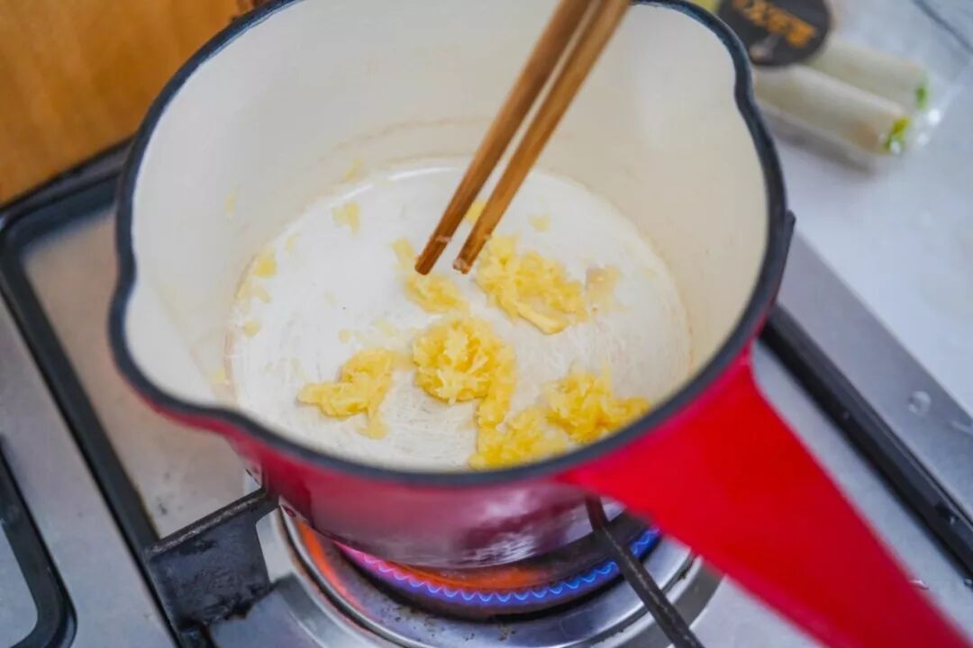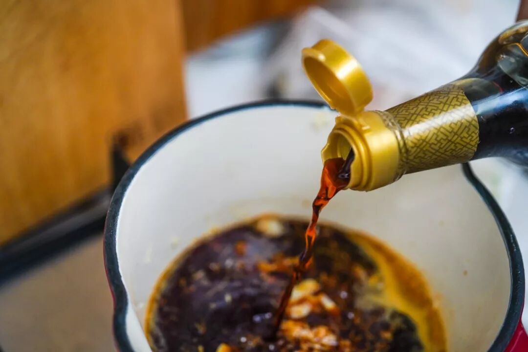 ✔️自制酱油。锅内先把蒜泥炒热,煸出香味后加入生抽,再适量加入一点糖,锅内煮开后就关火。