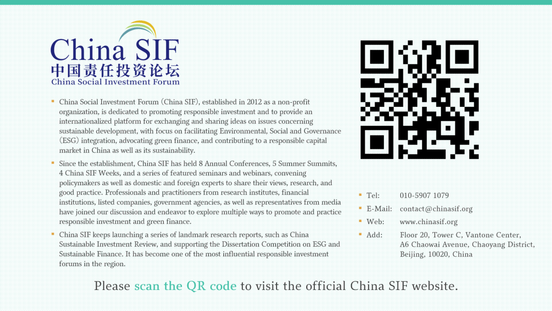 China Social Investment Forum (China SIF), established in 2012 as a non-profit organization, is dedicated to promoting responsible investment and to provide an internationalized platform for exchanging and sharing ideas on issues concerning sustainable development, with focus on facilitating Environmental, Social and Governance (ESG) integration, advocating green finance, and contributing to a responsible capital market in China as well as its sustainability.