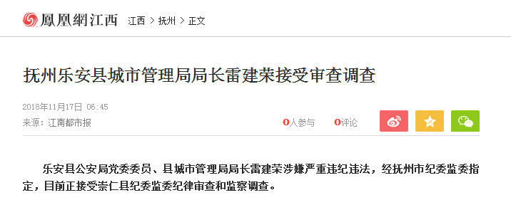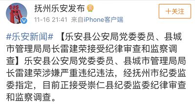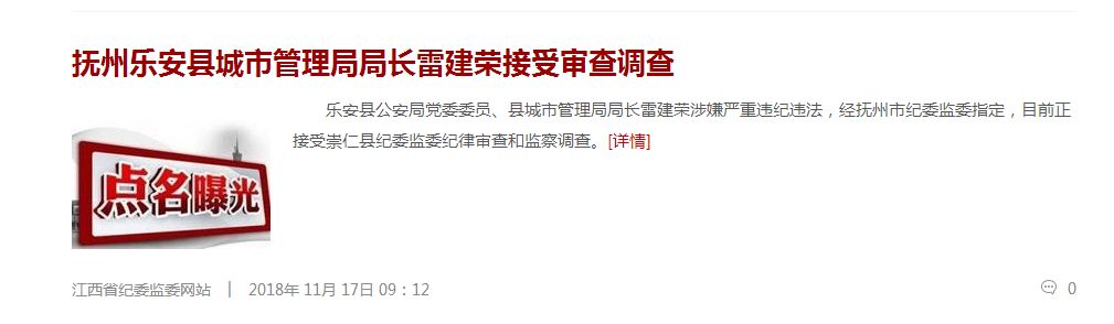 然而,早在11月中旬,《乐安县公安局党委委员、县城市管理局局长雷建荣接受纪律审查和监察调查》就已经被挂在了抚州市纪委监委网站上。