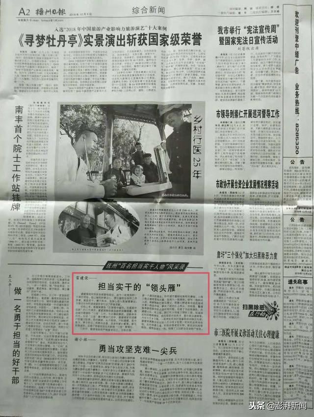 12月5日,《抚州日报》A2版,在《抚州“百名担当实干人物”风采录》版块里,刊发了一篇题目为《雷建荣:担当实干的“领头雁”》的文章。