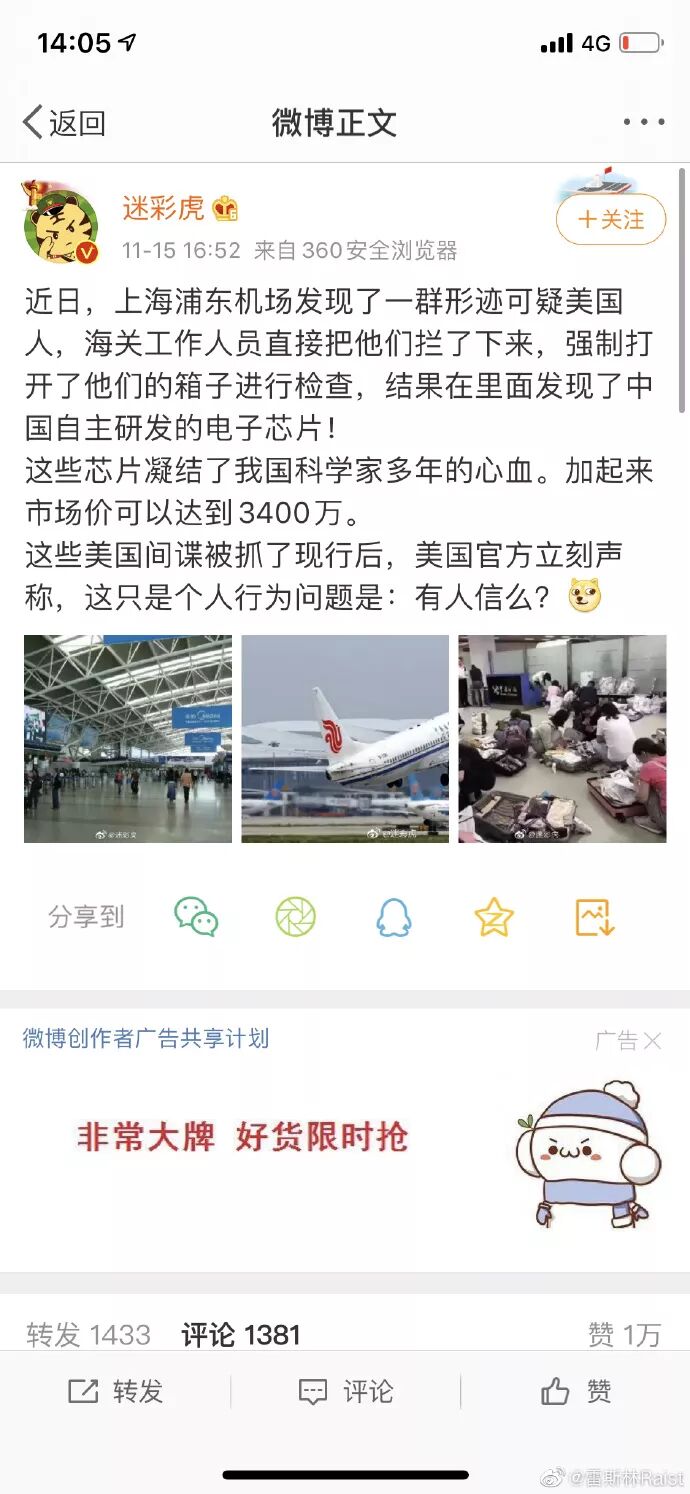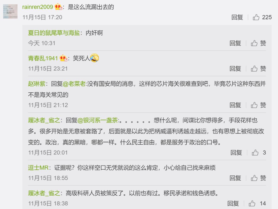 昨天的时候,他发微博表示美国派人来中国偷芯片了。