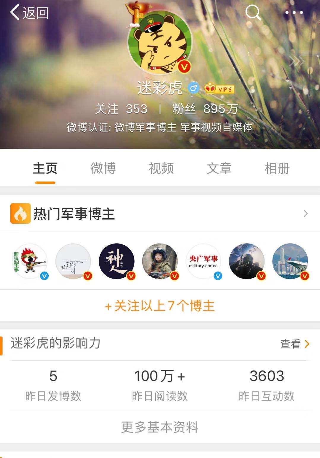 这是微博上一位拥有近千万粉丝的大V军事博主: