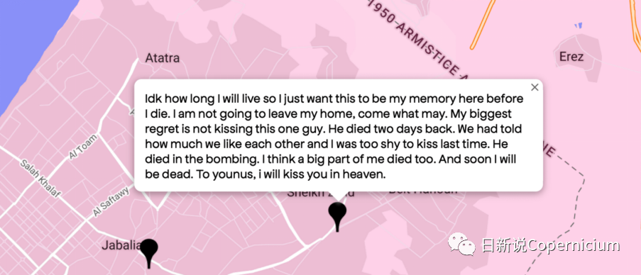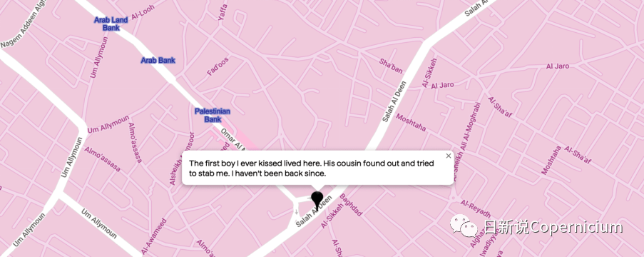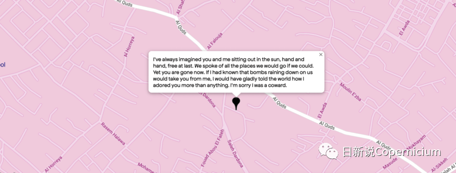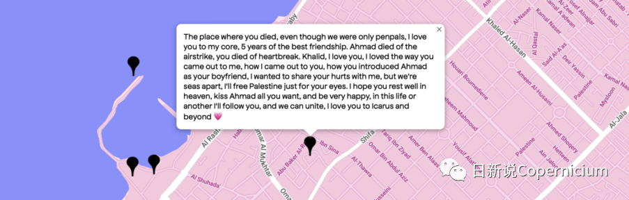 “酷儿地图”可以看作是在爱人被杀,自己的生命也即将结束之时,酷儿们记忆保存行为的数字化版本。看到巴勒斯坦人的身体被以色列的导弹摧毁的惊人恐怖之外,对加沙的巴勒斯坦人的记忆,也成为联结组织,联结像我一样的人们:我也曾有过第一次的心动,也曾有过恋爱,也曾因为各种各样的原因不得不将之隐藏。