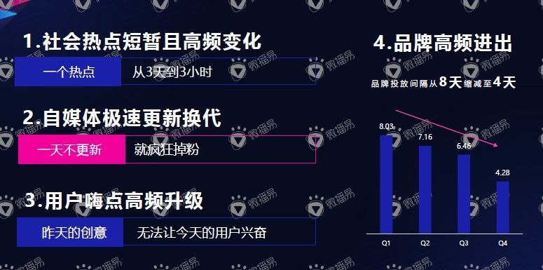 对品牌而言,新锐品牌更是高频进出,迫使品牌投放间隔从8天缩减至4天。Big Idea已很难适应高频变化的社交媒体。以服装带货自媒体为例,图文时代每月推3-5套服装,就足够产生效果,而现在每天都要在短视频平台推3-5套服装,才能不被遗忘。