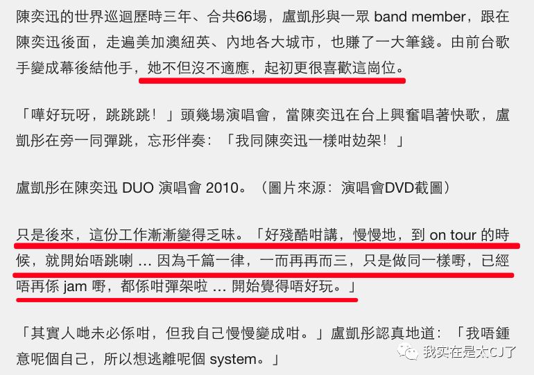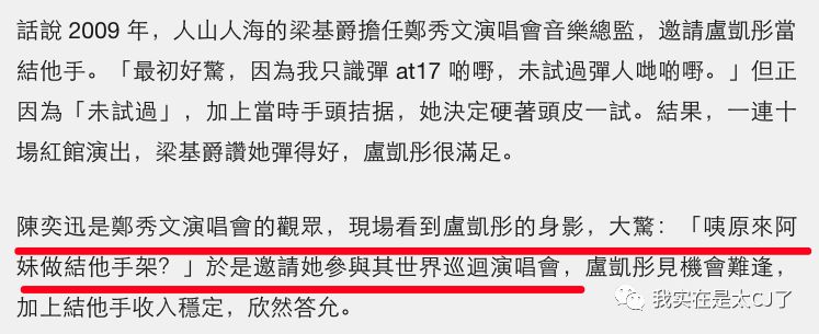 因为陈奕迅是看着她发展起来的,在at17解散前,卢凯彤已经试着为郑秀文演唱会做吉他伴奏了,去看Sammi演唱会的陈奕迅发现乐器伴奏组的卢凯彤,于是邀请她来加入自己的巡演。