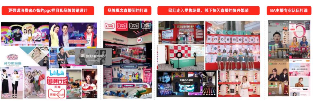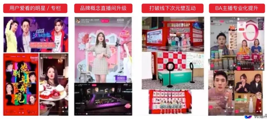 对于直播,重点在于积极挖掘和开展多角色直播合作,在直播场景中,打破线上线下的局限,筹划好看的内容。才是”好看“这个点最关键的秘籍。比如“用户爱看的明星/专栏“,“品牌概念直播间升级”,“打破线下次元壁互动”,和“BA主播专业化提升”等。