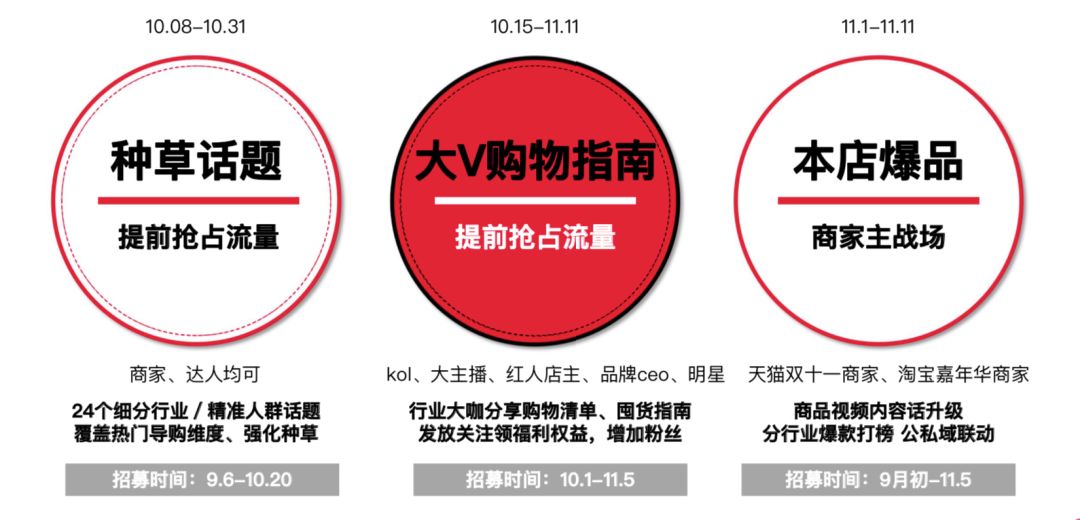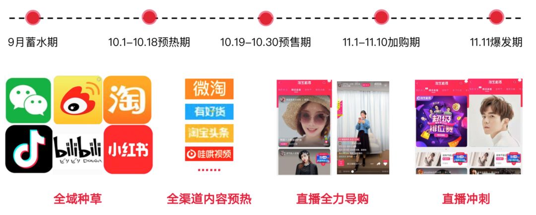 基于上图,我们可以发现,整个双十一的营销周期,从9月份的种草蓄水开始,到中间各内容形态的预热,预售,加购等一系列的节前营销,涉及形式包括不限于全渠道内容预热,直播全力导购等,一直持续到双十一当天最后的爆发,直接周期就达到了2个月以上。