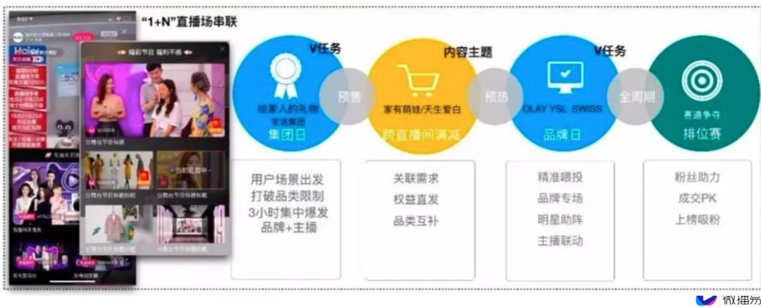 3、买爽。为消费者提供一站式购物体验,优化直播间品类的发现效率。采用1+N的直播间串联模式,让消费者逛的场景更聚焦,主题更强化。同时,也有利于打破品类局限,提升品类串联后的丰富度,流量更集中。