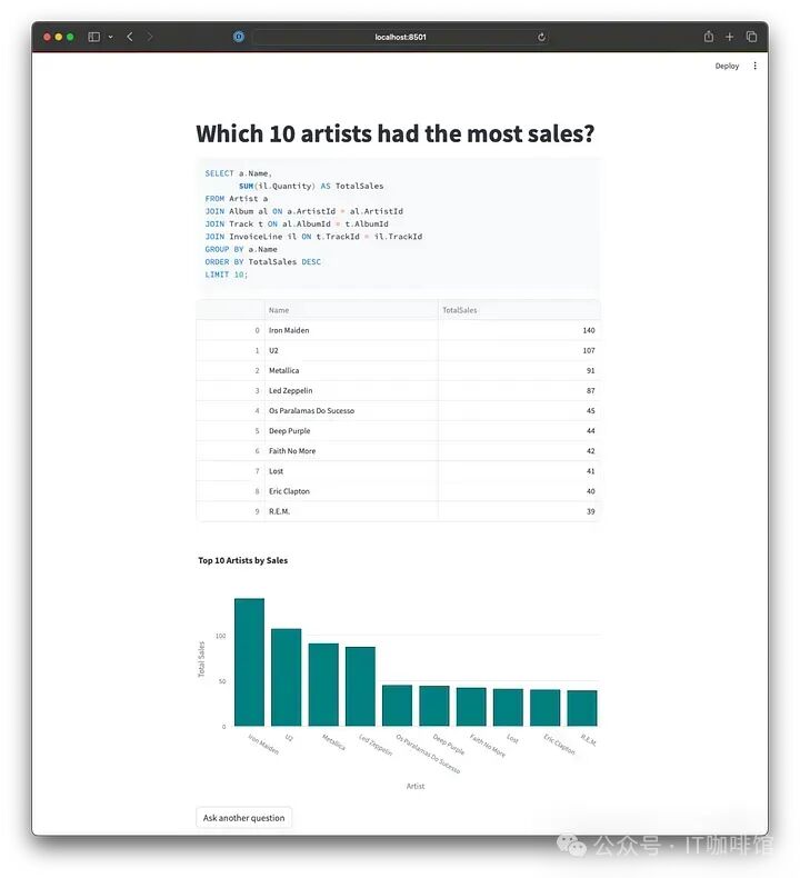 import vanna as vnimport streamlit as stvn.set_api_key(st.secrets["vanna_api_key"])vn.set_model('chinook')vn.connect_to_sqlite('<https://vanna.ai/Chinook.sqlite>')my_question = st.session_state.get("my_question", default=None)if my_question is None:st.image("chinook-schema.png", use_column_width=True)my_question = st.text_input("Ask me a question that I can turn into SQL", key="my_question")else:st.title(my_question)sql = vn.generate_sql(my_question)st.code(sql, language='sql')df = vn.run_sql(sql)st.dataframe(df, use_container_width=True)fig = vn.get_plotly_figure(plotly_code=vn.generate_plotly_code(question=my_question, sql=sql, df=df), df=df)st.plotly_chart(fig, use_container_width=True)st.button("Ask another question", on_click=lambda: st.session_state.clear())