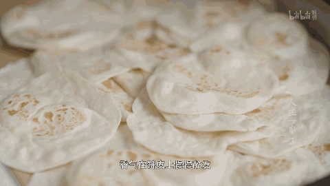 发酵好的酵母劲道有韧性,经过压制烤烙,饼皮上冒出数个焦黄色气泡,面香溢出屏幕来,用手撕开肉眼就能感受到的韧劲。