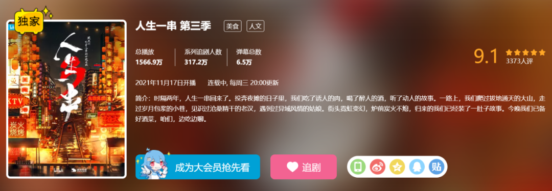 b站前两季播放量破两亿,新一季开播即破千万,都是《人生一串》创下的奇迹。