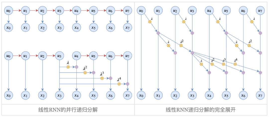 如果直接按照递归公式实现串行版的 RNN,那么训练速度将会非常慢(预测都是串行的自回归,所以预测没问题)。前面说了,线性 RNN 的一个重要特性是它本身有并行算法,可以大大加快训练速度。